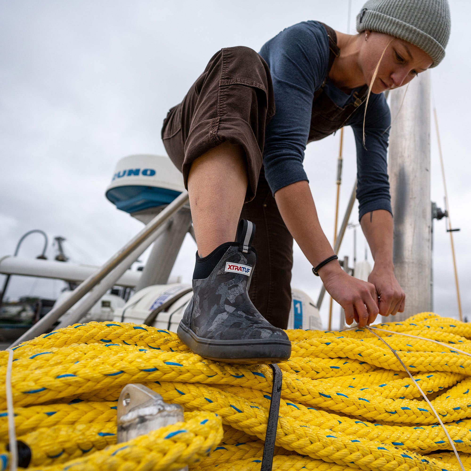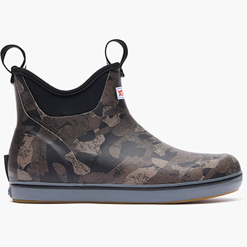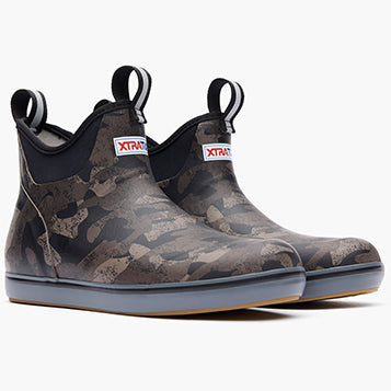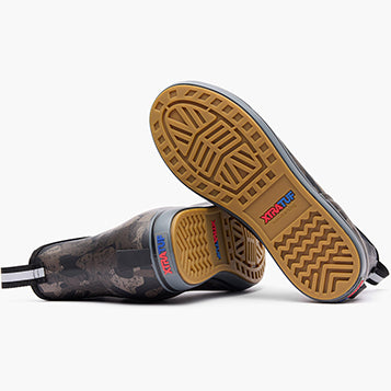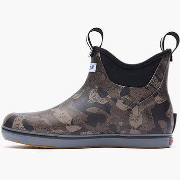 This??lightweight design has the same slip-resistant Chevron outsole found in our Legacy boots. The performance ankle deck boot is the perfect boot for any on the water athlete looking for protection with slip-on-and-go styling. This version delivers performance and style with an understated black camo design.